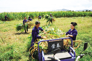 陳金娥正和員工一起收玉米稈,作為牛的飼料
