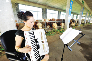 還沒走進(jìn)陳金娥的牛舍,就聽到了悠揚(yáng)的樂曲聲,陳金娥說,她每天都會(huì)給牛播放音樂,自己興致好的時(shí)候,還會(huì)親自給牛們拉拉手風(fēng)琴。給牛聽音樂,能讓牛放松,對(duì)牛的生長(zhǎng)很有好處。陳金娥說,牛跟人一樣,也要用感情去養(yǎng)。讓牛聽音樂,給牛按摩、洗澡,牛會(huì)感覺特別舒服,牛的肉質(zhì)也會(huì)更好。
