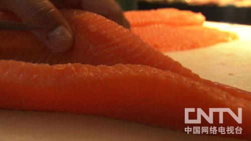 廚師長孫喜華:他找到酒店以后,說他有活三文魚了,活三文魚,他當(dāng)時(shí)一說我就很吃驚,因?yàn)橹暗竭^的酒店,全是進(jìn)口的死的三文魚,他說有活的我就感覺挺新奇的。